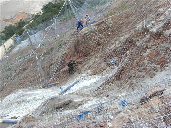 柔性防护网:作用原理上类似于喷锚和土钉墙等面层护坡体系,但因其柔性特征能使系统将局部集中荷载向四周均材质:钢丝绳网、普通钢丝格栅(常称铁丝格栅)和TECCO高强度钢丝格栅 匀传递以充分发挥整个系统的防护能力,即局部受载,整体作用,从而使系统能承受较大的荷载并降低单根锚杆的锚固力要求 。具有高柔性,高防护强度,易铺展性。适应任何坡面地形,安装程序标准化、系统化。系统采用模切化安装方式,工期短,施工费用低。系统材料的特殊制造工艺和高防腐防锈技术,决定了系统的超高寿命。系统能将工程队环境的影响降到最低点,其防护区域可以充分的保护土体、岩石的稳固,便于人工绿化,有利于环保。