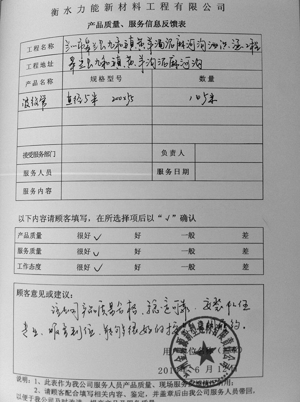 兰州市对衡水贝尔克波纹涵管产品质量和服务信息的反馈意见或建议: