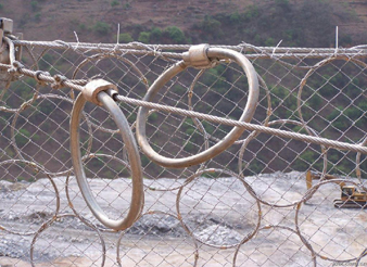 被动环形边坡柔性防护网是由钢丝绳网、环形网、(需拦截小块落石时附加一层铁丝格栅)、固定系统(锚杆、拉锚绳、基座和支撑绳)减压环和钢柱四个主要部分构成。钢柱和钢丝绳网连接组合构成一个整体,对所防护的区域形成面防护,从而阻止崩塌岩石土体的下坠,起到边坡防护作用。